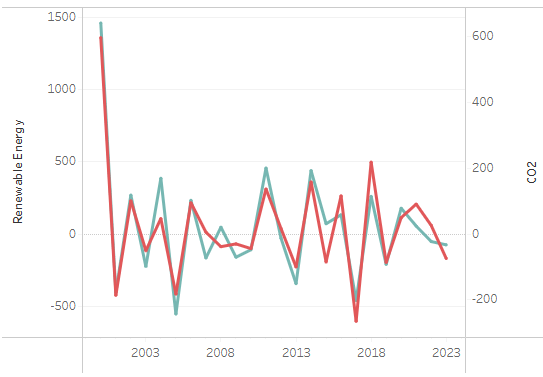 Conventional wisdom often assumes that boosting renewables immediately cuts emissions, but the data tells a different story as we can see how Renewable Energy has the same pattern as CO2 Emission.