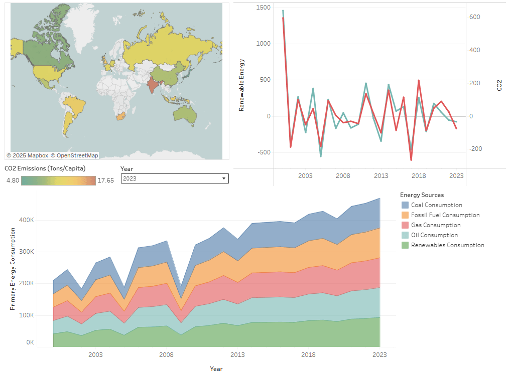 This project investigates worldwide CO2 emissions trends, energy consumption breakdowns, and the evolving relationship between renewable energy adoption and overall emissions. Through interactive data visualizations, the project aims to highlight how energy choices impact the environment and to challenge commonly held assumptions about the role of renewables in emissions reduction.