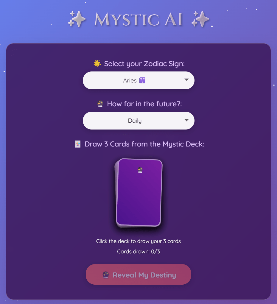 This web application offers personalized fortune readings by combining horoscope data and tarot card draws using Gemini AI and external APIs. The goal is to provide unique mystical insights tailored to users’ Zodiac signs and preferences.